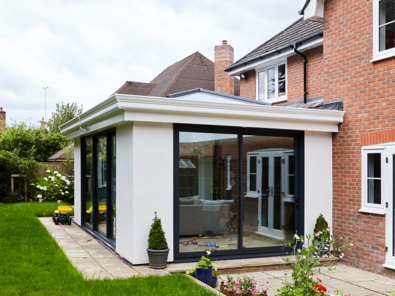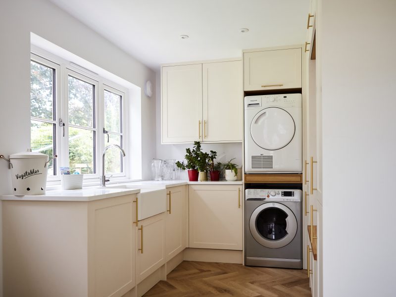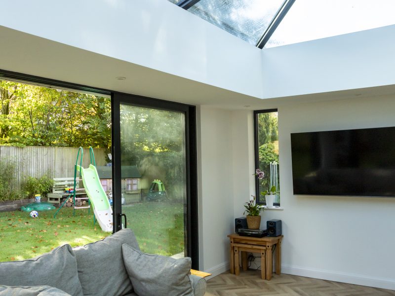 James and his wife chose to have a flat roof on their hup! with a large lantern over the lounge area to create a beautiful focal point and also bring a huge amount of light into the new room below. The design included two sets of sliding doors on the rear and side aspects of the hup! to create the link out to their garden, and allow the family to enjoy views of the outdoors, whatever the weather. They chose flush finish windows for the new utility to complement those on the rest of their home.